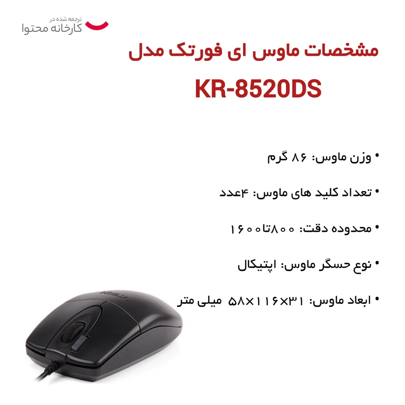 باندل ماووس و صفحه کلید ای فورتک مدل KR-8520DS، در دسته صفحه کلید و ماووس های اقتصادی با مصرف اداری/خانگی است که با اتصال باسیم و رابط USB به رایانه شخصی شما متصل میشود، صفحه کلید این دستگاه دارای حروف فارسی حک شده است که در نتیجه آن را گزینه ای مناسب برای تایپ متون فارسی میکند، کلید های جزیره ای با لبه های گرد و فرو رفتگی سطحی و ساختار کم صدا و بازخورد دقیق، این کیبورد را مناسب برای تایپ های طولانی مدت، محیط های اداری و مصارف خانگی کرده، این باندل دارای یک ماووس با سیم است که با توجه اندازه اش، مناسب برای دست های کوچک و بزرگ است، این ماووس از نوع اپتیکال است و علاوه بر کلید های چپ، راست و اسکرول، یک کلید برای دابل کلیک نیز بر روی آن تعبیه شده است، همچنین کلید های این ماووس از نوع بی صدا است که در نتیجه برای استفاده در محیط های ساکت، خانه و اداری آن را به بهترین گزینه با توجه به برچسب قیمتی آن تبدیل کرده است.