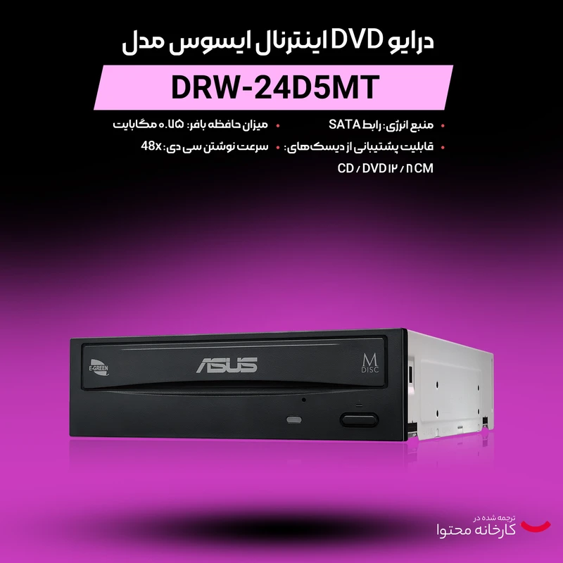 در هنگام انتخاب قطعات سخت افزاری، دی وی دی «رایتر» را می توان یکی از انتخابهای مهم هر رایانه دانست. در انتخاب دی وی دی رایتر سرعت خواندن و نوشتن یکی از مهمترین معیارها به حساب می آید. «DRW-24D5MT» یک دی وی دی رایتر اینترنال با سرعت 24X محصول شرکت خوشنام ایسوس (ASUS) است. با قراردادن این دی وی دی رایتر در جعبه کیس رایانه و اتصال آن، میتوانید به خواندن اطلاعات لوحهای فشرده در قالب CD و DVD اقدام کنید. همچنین به کمک 24D5MT می توانید بر روی CD و DVD خام رایت کنید. این محصول شرکت ایسوس، 50 درصد در مصرف انرژی صرفهجویی کرده و از تمامی نسخههای سیستمعامل ویندوز بهطور کامل پشتیبانی میکند.