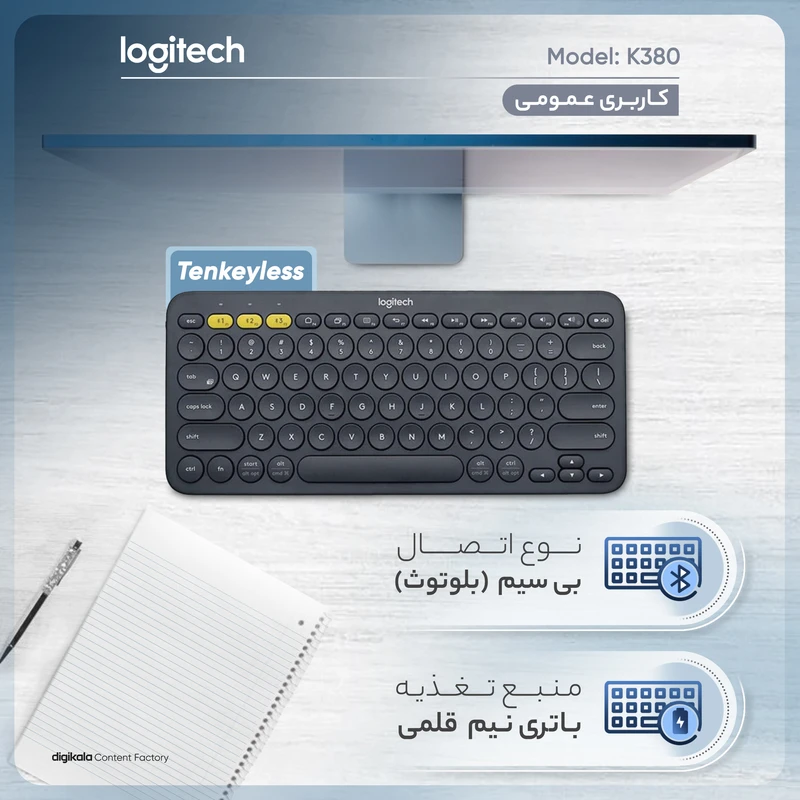 اتصال Bluetooth 3.0 این کیبورد به کاربران اجازه میدهد تا فاصله 10 متری از دستگاه خود، بدون نگرانی از قطع اتصال، از کیبورد استفاده کنند. این ویژگی به ویژه برای کاربرانی که به دنبال آزادی عمل بیشتری در محیط کار خود هستند، بسیار جذاب است. اتصال بلوتوث به کاربران این امکان را میدهد که کیبورد را به راحتی با دستگاههای مختلف مانند لپتاپ، تبلت و گوشیهای هوشمند هم استفاده کنند، که این امر چند وظیفهای بودن و استفاده از چند دستگاه را بسیار آسان میکند. کیبورد K380 دارای 68 کلید استاندارد و 13 کلید میانبر است که به کاربران امکان میدهد تا به سرعت به عملکردهای مختلف دسترسی پیدا کنند. این کلیدهای میانبر طراحی شدهاند تا بهرهوری و کارایی کاربران را افزایش دهند و تجربه کاربری راحتتری را فراهم کنند. نبود بخش عددی یا همان فرم Tenkeyless، این کیبورد را بسیار جمعوجور کرده و فضای کمتری روی میز کار اشغال میکند. این موضوع برای کاربرانی که فضای محدودی دارند یا به کیبورد قابل حمل نیاز دارند، بسیار مهم است. یکی از ویژگیهای برجسته کیبورد K380، عمر باتری طولانی آن است. این کیبورد با استفاده از دو عدد باتری AAA میتواند تا 24 ماه بدون نیاز به تعویض باتری کار کند. این عمر باتری طولانی، نگرانی کاربران را از بابت شارژ مکرر یا تعویض باتری کاهش میدهد و تجربه استفاده بیدغدغهای را ارائه میدهد. این ویژگی به خصوص برای کسانی که به دنبال یک کیبورد با نیازهای نگهداری کم هستند، بسیار جذاب و کاربردی است.